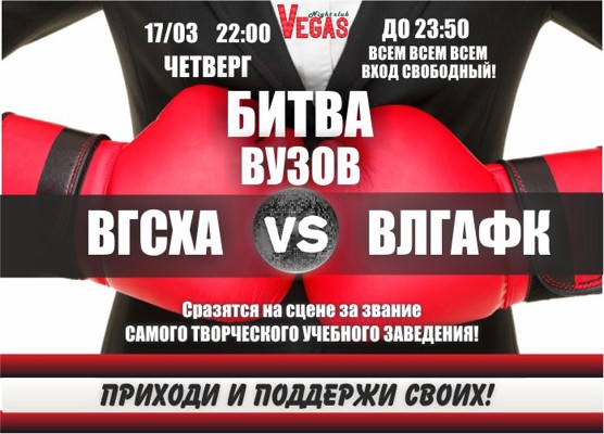 Битва вузов в Vegas 16+ 14 марта 2016 11:33 0 Клуб «Вегас»17 марта — 22:00Адрес: проспект Гагарина, 118Телефон: +7 911 382 24 40 Поделиться:
