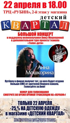 Концерт в поддержку Ани Мошкориной 6+ 19 апреля 2016 16:32 0 ТЦ «Рубин», 2 этаж22 апреля — 18:00 Поделиться: