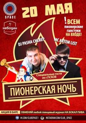 Пионерская ночь в Space 18+ 17 мая 2016 15:35 0 Клуб Space20 маяАдрес: пр. Ленина, д. 55аТелефон: +7 911 363 1323; 8 (81153) 560-90 Поделиться: