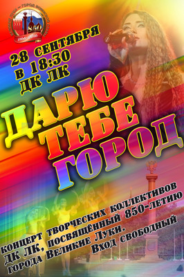 Концерт «Дарю тебе город» 6+ 22 сентября 2016 11:04 0 ДК ЛК28 сентября — 18:30Адрес: ул. Зверева, 29Телефон: 5-72-75 Поделиться: