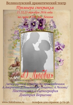Спектакль «О любви» 12+ 2 октября 2016 14:49 0 комедия Постановка Дмитрий БорисовДК имени Ленина21, 22, 23, 26 октябряАдрес: ул. Малышева, 6Телефон: 3-72-36 Поделиться: