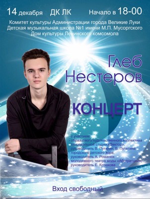 Глеб Нестеров 6+ 23 ноября 2016 17:14 0 ДК ЛК14 декабря — 18:00Адрес: ул. Зверева, 29Телефон: 5-72-75 Поделиться: