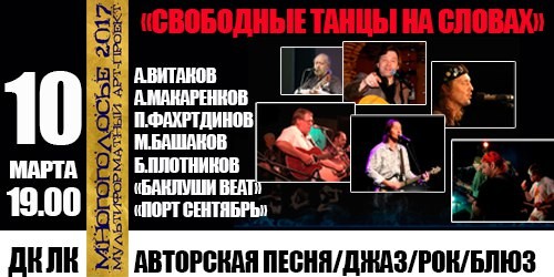 Концерт «Свободные танцы на словах» 12+ 24 января 2017 11:27 0 ДК ЛК10 марта — 19:00Адрес: ул. Зверева, 29Телефон: 5-72-75 Поделиться:
