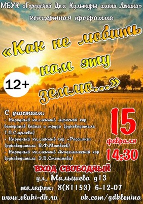 Концерт «Как не любить нам эту землю...» 12+ 27 января 2017 17:18 0 ДК имени Ленина15 февраля — 14.30Адрес: ул. Малышева, д.13Телефон: 6-12-07 Поделиться: