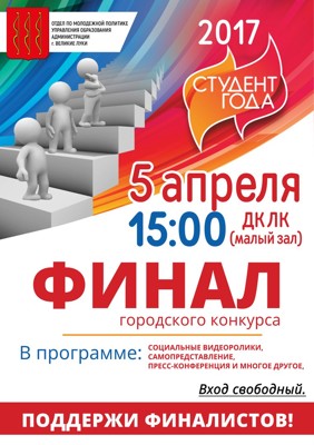 Финал конкурса студент года 2017 12+ 10 марта 2017 11:08 0 ДК ЛК5 апреля — 15:00Адрес: ул. Зверева, 29Телефон: 5-72-75 Поделиться: