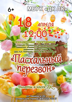 Концерт «Пасхальный перезвон» 6+ 4 апреля 2017 13:58 0 ДК имени Ленина18 апреля — 12.00Адрес: ул. Малышева, д.13Телефон: 6-12-07 Поделиться: