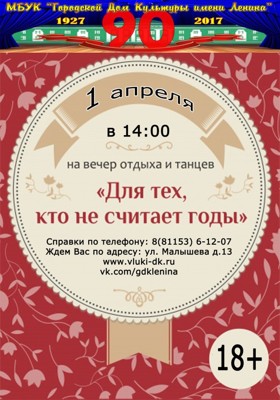Вечер отдыха и танцев «Для тех, кто не считает годы» 18+ 26 марта 2018 14:14 0 Городской Дом Культуры имени Ленина1 апреля — 14:00Адрес: улица Малышева, 13Телефон: 6-12-07 Поделиться: