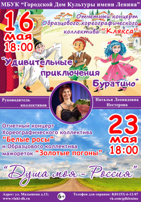 Концерт «Удивительные приключения Буратино» и «Душа моя — Россия» 6+ 7 мая 2018 10:30 0 Городской Дом Культуры имени Ленина16 мая — 18:00 и 23 мая 18:00Адрес: улица Малышева, 13Телефон: 6-12-07 Поделиться: