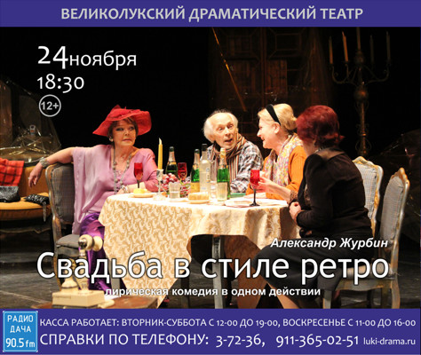 Свадьба в стиле ретро 12+ 2 июля 2018 11:43 0 МБУК «Великолукский драматический театр» Адрес: пр-т Октябрьский, 28/13Телефон: 3-72-36, +7 911-365-02-51 Поделиться:
