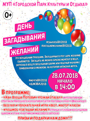 День загадывания желаний 0+ 13 июля 2018 14:19 0 Городской Парк Культуры и Отдыха28 июля — 14:00Адрес: Краснофлотская набережная, 13 Поделиться: