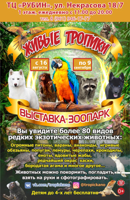 Выставка-зоопарк «Живые тропики» 0+ 14 августа 2018 9:30 0 ТЦ «Рубин» с 16 августа по 9 сентября — с 11:00 до 20:00Адрес: улица Некрасова, 18/7Телефон: 8 (961) 946-17-77 Поделиться: