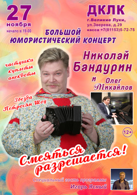Большой юмористический концерт «Смеяться разрешается!» 12+ 26 сентября 2018 15:05 0 ДК ЛК 27 ноября — 19:00Адрес: улица Зверева, 29Телефон: 5-72-75 Поделиться: