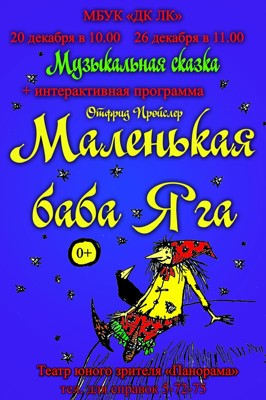Музыкальная сказка «Маленькая баба Яга» 0+ 9 ноября 2018 9:15 0 ДК ЛК 20 декабря — 10:0026 декабря — 11:00Адрес: улица Зверева, 29Телефон: 5-72-75 Поделиться: