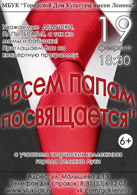 Всем папа посвящается 6+ 28 января 2019 16:23 0 Городской Дом Культуры имени Ленина19 февраля — 18:30Адрес: улица Малышева, 13Телефон: 6-12-07 Поделиться: