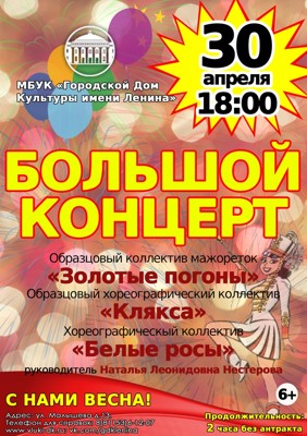 Большой концерт 6+ 8 апреля 2019 15:02 0 Городской Дом Культуры имени Ленина30 апреля — 18:00Адрес: улица Малышева, 13Телефон: 6-12-07 Поделиться: