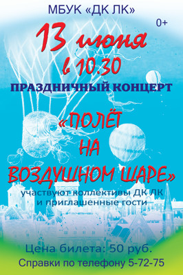 Праздничный концерт «Полет на воздушном шаре» 0+ 10 апреля 2019 11:43 0 ДК ЛК 13 июня — 10:30Адрес: улица Зверева, 29Телефон: 5-72-75 Поделиться: