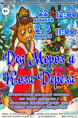 Дед Мороз и Коза Дереза 0+ 20 ноября 2019 10:19 0 ДК имени Ленина 22 декабря — 12:002 января — 11:005 января — 11:00Адрес: улица Малышева, 13Телефон: 6-12-07 Поделиться: