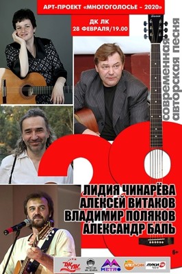 Современная авторская песня 6+ 22 января 2020 16:06 0 ДК ЛК 28 февраля — 19:00Адрес: улица Зверева, 29Телефон: 5-72-75 Поделиться: