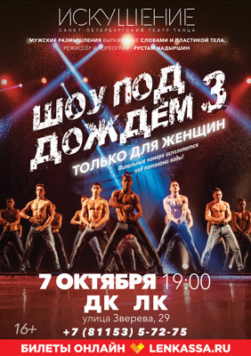 Шоу под дождем 3 16+ 10 сентября 2020 15:59 0 ДК ЛК 7 октября в 19:00Адрес: улица Зверева, 29Телефон: 5-72-75 Поделиться: