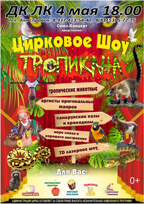 Цирковое шоу «Тропикана» 0+ 22 апреля 2021 9:10 0 ДК ЛК 4 мая в 18:00Адрес: улица Зверева, 29Телефон: 5-72-75 Поделиться: