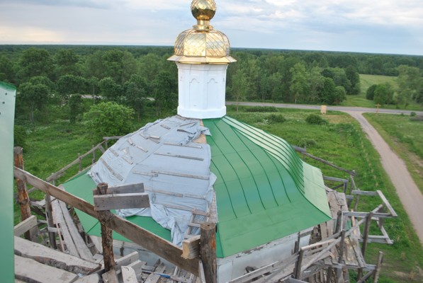 Сейчас купол храма укрыт железным плащом более чем наполовину. К очередному выезду в Заклюку 8 — 9 июля купол обретет свой законченный первозданный вид.