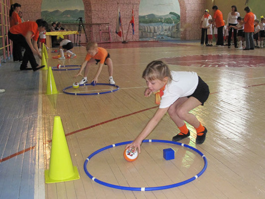 - Эстафета комбинированная — ребенок по свистку начинает бег по дорожке, затем подлезает под легкоатлетический барьер, добегает до фишек, бегом возвращается назад. Передает эстафету маме. Мама начинает движение на скакалке, возле фишек оставляет скакалку, назад возвращается «гусиным шагом», передает эстафету папе. Папа начинает движение бегом, перепрыгивает через легкоатлетический барьер, второй барьер пролезает внизу, обегает вокруг фишки и возвращается бегом