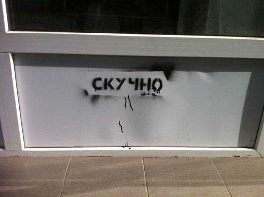 Аккуратно выведенные по трафарету буквы «СКУЧНО» начали появляться в самых неожиданных местах города, на домах центральных районов и даже фонтанах — что это: вандализм или попытка привлечь внимание к своим проблемам? Вспоминается известный советский мультфильм про крокодила Гену и Чебурашку — тот момент, когда Гена спрашивает малыша, залезшего сначала на пожарную лестницу, а потом провалившегося в канализационный люк: «Ну, зачем, зачем ты туда полез? Тебе что делать нечего?», и дети ему отвечают: «Нечего. Совсем нечего».