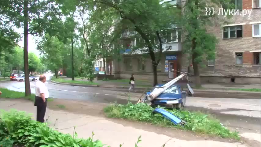 В результате аварии фонарный столб упал на лобовое стекло автомобиля.