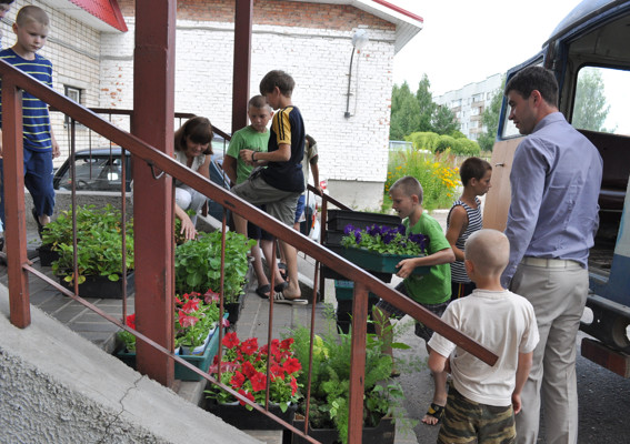 В настоящее время большая часть детей находится в загородных оздоровительных лагерях, а те, кто был на месте, с радостью пообщались с гостем и приняли от него подарки в виде рассады растений, которую выращивают для города на базе дорожно-строительного комбината. В этом году около 130 кустов земляники, уличные летние цветы — петуния, вербена, львиный зев, агератум, рудбекия и портулак украсят территорию детского дома.