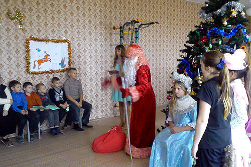 В канун Нового года ребята одной из школ Великолукского района отправляются в реабилитационный Центр для того, чтобы вручить эти подарки. В этом году 24 декабря в гости к ребятам в д. Русаново прибыли Дед Мороз и Снегурочка из Булынинской школы. Ребята под руководством Елены Ренни подготовили новогоднее представление с конкурсами, стихами и веселыми новогодними песнями. Во время представления дети помогали Деду Морозу расколдовать Снегурочку, водили хоровод вокруг елки, танцевали и рассказывали стихи.