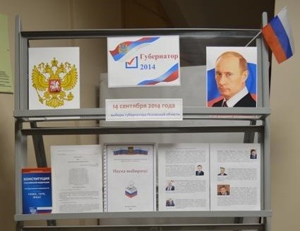 С 14 августа в фойе центральной городской библиотеки имени Семевского работает выставка «Губернатор 2014», подготовленная к предстоящим выборам главы региона Псковской области. На ней представлены законодательные материалы, литература и статьи из периодики, посвященные избирательной системе. Сотрудником центра правовой информации составлен библиографический указатель «Наука выбирать». На выставке также можно ознакомиться с биографиями кандидатов в губернаторы Псковской области.