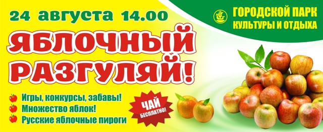 В воскресенье, 24 августа, в 14.00 в парке начнется глобальный яблочный разгуляй с веселыми играми, конкурсами, забавами. Гости попробуют вкуснейшие русские пироги с яблоками, а чай получат совершенно бесплатно. На празднике будет также организована ярмарка по продаже яблок из великолукских садов.