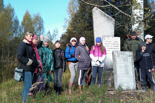 Через два часа участники пришли на братское захоронение мирных жителей на окраине деревни Решетково. Это небольшая земляная насыпь с установленным крестом, обнесенная железной оградкой. Дети привели в порядок место захоронения, убрали листья, сухую траву, повязали георгиевские ленточки.