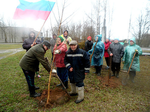 И хотя с утра моросил мелкий дождик, это не смутило даже пожилых ветеранов, ведь на войне они сражались и трудились на благо фронта в любую погоду. Участник войны Михаил Шепляков и труженики тыла Ксения Клевцова и Николай Добрягин с удовольствием приняли участие в посадке берез в заботливо приготовленные заранее лунки. Под Российским триколором процессия во главе с администрацией волости прошествовала к месту посадки деревьев — памятнику «землякам, ушедшим на фронт и не вернувшимся». Глава волости Любовь Богатырева сказала несколько теплых слов в адрес ветеранов и отметила, что они снова в строю, и непогода им не помеха.