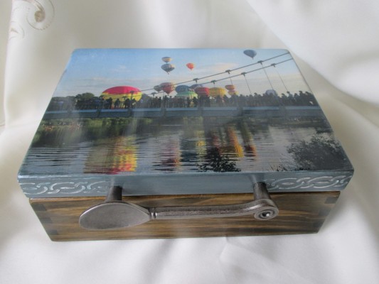 В художественном салоне представлены работы в технике декупаж, выполненные мастерами декоративно-прикладного творчества Людмилой Лабецкой и Еленой Капелевич. В оформлении оригинальных винтажных шкатулок для чайных пакетиков, футляров для письменных принадлежностей, календарей использованы репродукции известных картин на тему воздухоплавания, а также фотографии великолукского фотографа Александра Артемьева. Есть в коллекции и шкатулки в виде старинных фолиантов, изделия, посвященные женщинам-пилотам аэростата.