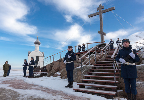 После церемониала под звуки гимна Российской Федерации прозвучали оружейные залпы, военнослужащие прошли парадным маршем.