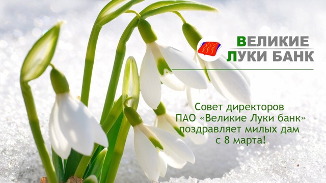 Совет директоров и правление ПАО «Великие Луки банка» поздравляет всех женщин с праздником весны и любви — 8 марта! Милые дамы, пусть этот день наполнится для вас яркими красками от большого количества цветов и светом от добрых улыбок! Мы искренне желаем вам счастья, любви, весеннего настроения, домашнего уюта и благополучия.
