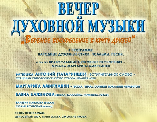 Великолучан приглашают встретить Вербное воскресенье духовной музыкой в кругу друзей