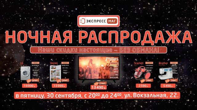 Только 30 сентября в пятницу с 20:00 до 24:00 в магазине бытовой техники и электроники «ЭкспрессМаг» тотальные скидки.