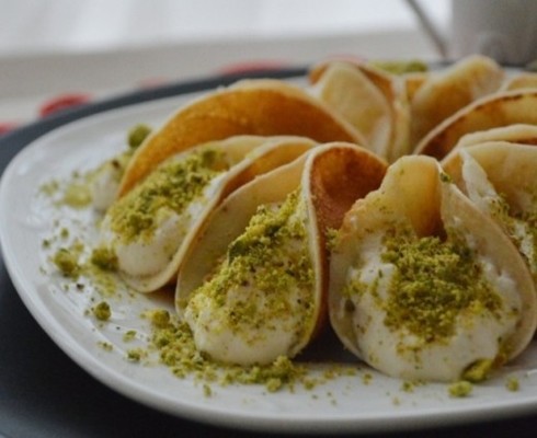 В нашем, более «европейском», варианте, катаеф — это десерт, представляющий собой дрожжевые блины со сладкой начинкой. Последней могут служить — заварной крем, взбитые сливки, творог, мед, шоколад… Все, на что хватит фантазии сладкоежки.