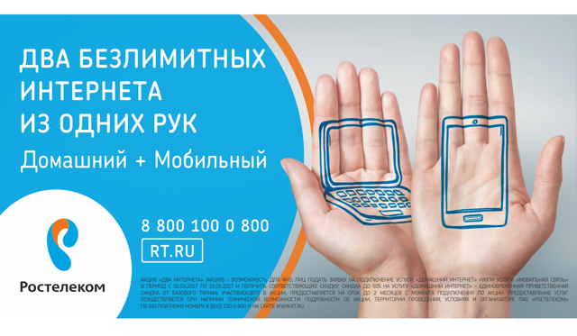 «Ростелеком» предлагает отличное решение для семейного бюджета. Чем больше услуг от нашей компании использует семья — тем больше экономия. Акция «Два интернета» стартует в первый весенний день, когда хочется подумать и об обновлении гардероба, и о дачном сезоне, и о предстоящем отпуске. Новая федеральная акция поможет подготовиться семейному бюджету. Привычные домашние услуги теперь можно буквально взять с собой — в дорогу или на дачу. Например, пользоваться качественным доступом в интернет как дома, так и за пределами квартиры.
