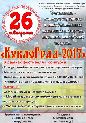 26 августа в рамках празднования Дня города пройдет фестиваль-конкурс семейных и самодеятельных кукольных театров, выставка авторских игрушек «КуклоГрад 2017». Приглашаем всех желающих принять участие в этом празднике.