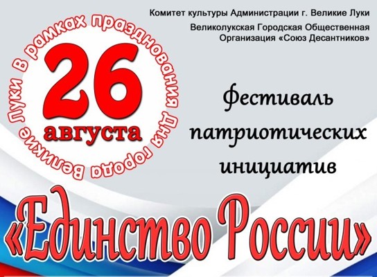 26 августа на летней эстраде пройдет фестиваль патриотических инициатив «Единство России». Организатор — ДК имени Ленина приглашает великолучан, а также жителей других городов и районов Псковской области, принять участие в мероприятии.