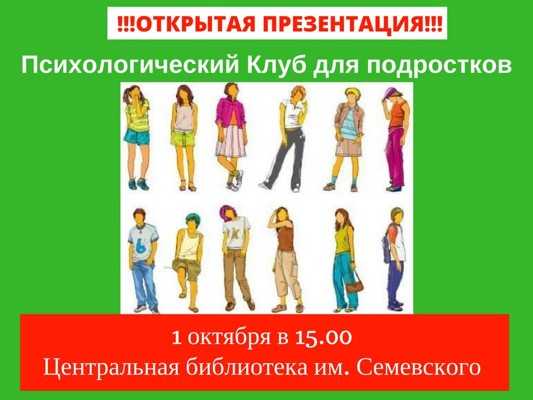 1 октября в 15.00 центр психологии Натальи Меньшиковой приглашает на презентацию нового проекта — психологический клуб для подростков.