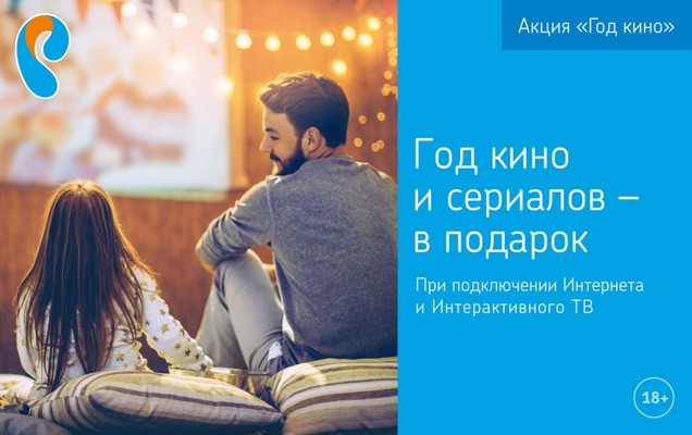 По условиям акции «Год кино» при подключении пакета услуг «Домашний интернет» и «Интерактивное ТВ» новых абонентов ждет отличный подарок — 20 кино и сериальных каналов, а также более 100 лучших сериалов планеты и премиальные телеканалы от Amediateka Home of HBO. Такой подарок сэкономит для семейного бюджета более 5 000 рублей в течение года.