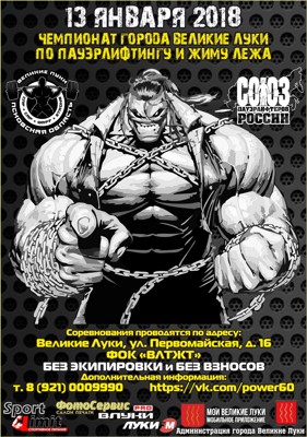 Открытый чемпионат города по пауэрлифтингу и жиму лежа пройдет 13 января 2018 года в физкультурно-оздоровительном комплексе «ВЛТЖТ» по адресу: улица Первомайская, дом 16. Соревнования начнутся в 11.00.