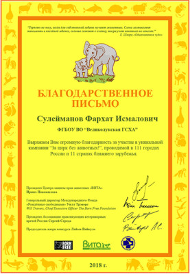 В этом году Президент Центра защиты прав животных «Вита» и кампания «Наука без жестокости» передали профессору кафедры ветеринарии ФГБОУ ВО «Великолукская государственная сельскохозяйственная академия» Фархату Исмаиловичу Сулейманову благодарственные письма за гуманное образование и отказ от опытов над животными в учебном процессе, сообщает пресс-служба вуза.