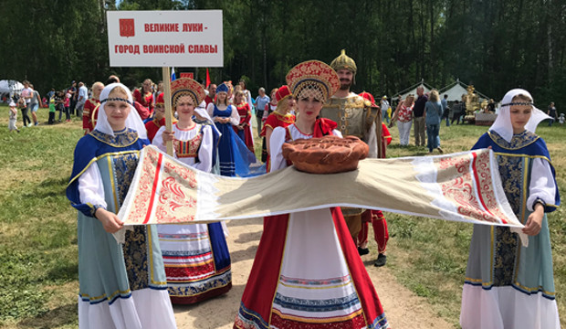 Делегация города на Ловати основательно подготовилась к своему выходу на параде творческих коллективов области, который открывал праздник. Великолучане не просто прошли дружным строем по Михайловской поляне, а презентовали целый мини-спектакль «Сказания Земли Великолукской». Возглавлял шествие Александр Сергеевич Пушкин со своими друзьями — Иваном Пущиным, Антоном Дельвигом, Александром Горчаковым, Николаем Языковым. За ними шли 33 богатыря, артисты, скоморохи, мельники, музыканты, оркестры и весь честной народ.
