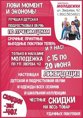Магазин подростковой и детской одежды и обуви «Молодежка» объявляет 6 дней тотальной распродажи! С 15 по 20 июня вы сможете приобрести детскую и подростковую одежду всех сезонов, а также школьные коллекции со скидками 30 и 40%.