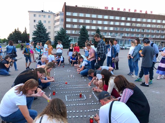 Затем участники акции зажгли свечи, которые были выложены в форме словам «ПОМНИМ».